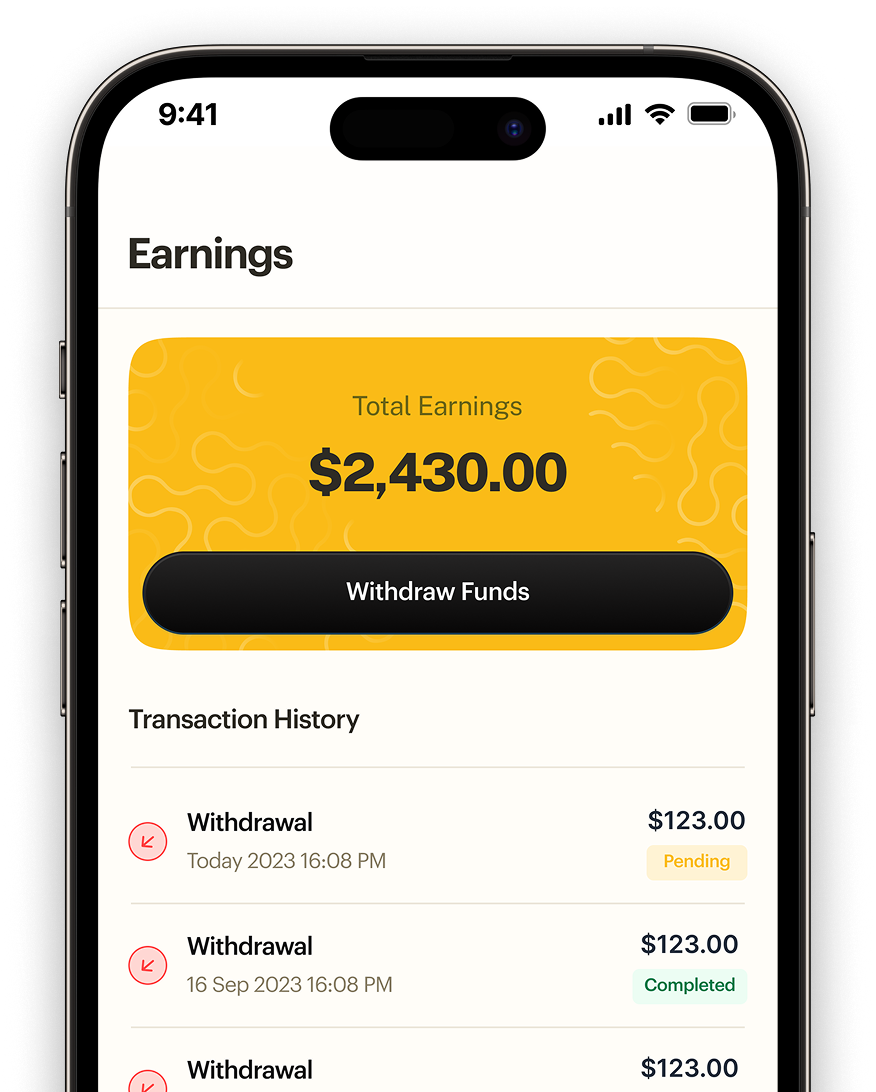 Weekly Payouts: Earnings are automatically transferred to your bank account every week.